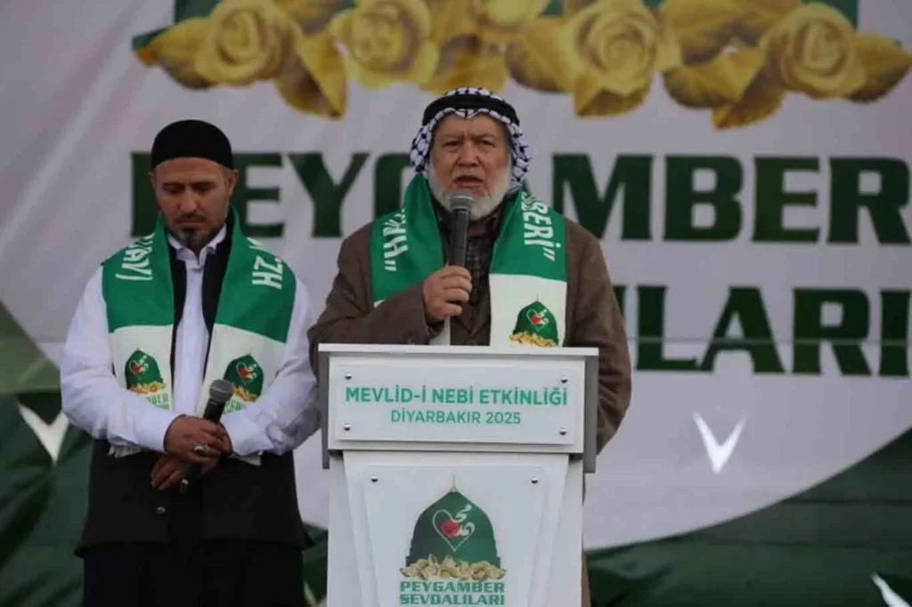 Diyarbakır’da gerçekleştirilen Mevlid-i Nebi programında, Filistin direnişinin önemli isimlerinden biri olan Dünya Âlimler Birliği Filistin Komisyonu Başkanı ve HAMAS Milletvekili Mervan Ebu Ras da sahne aldı. Konuşması öncesinde sunucular, Ebu Ras’ın işgalci Siyonistlerin saldırılarında onlarca yakınını şehit verdiğini vurgulayarak kendisini duygusal bir şekilde kürsüye davet etti.