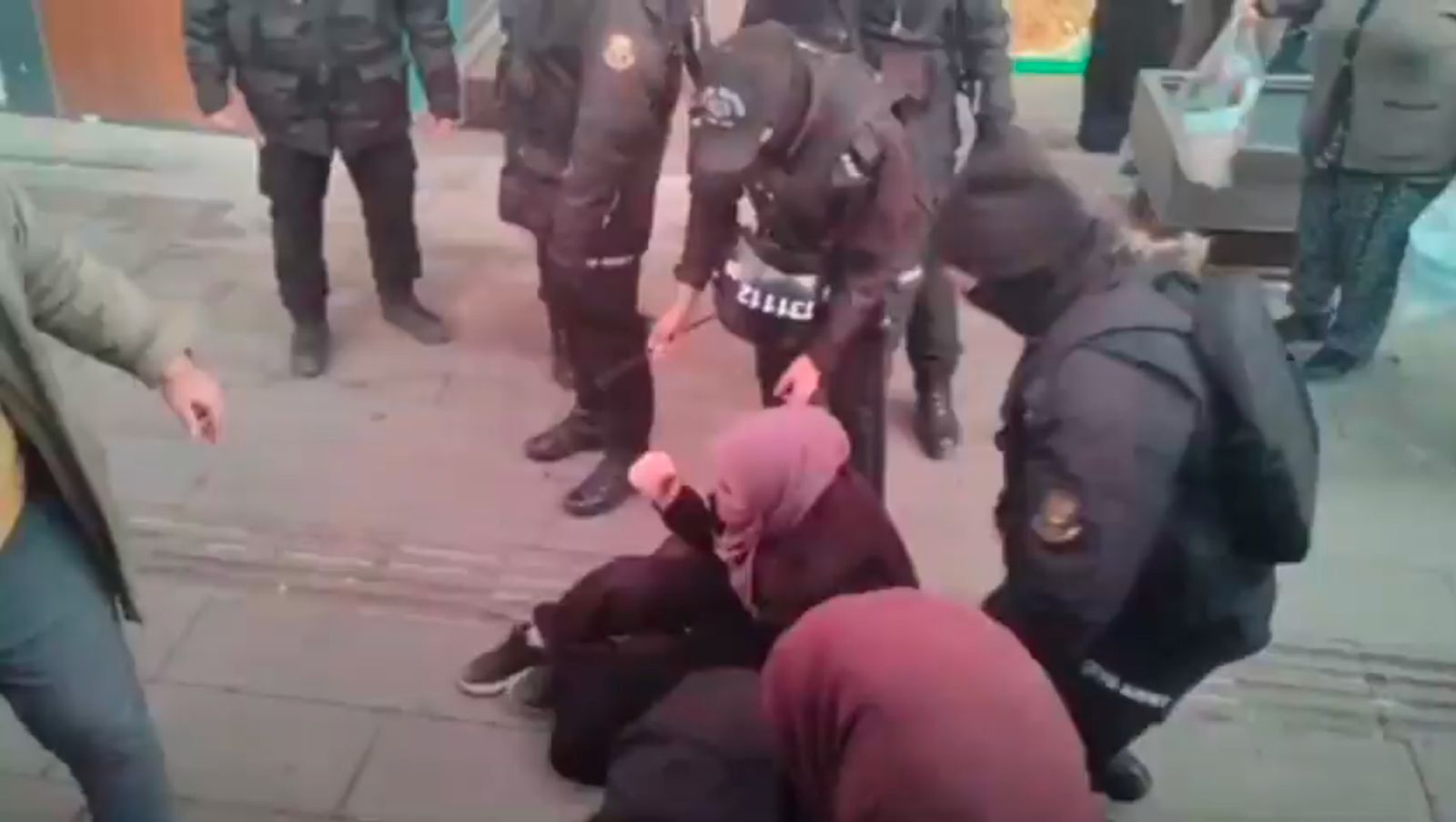 Bir emniyet personeli, etrafı çevrilen ve yere yatırılan vakıf mensubu bir kadına tekme attı. O görüntüler gözaltına alınıp ekip otobüse konulan kişilerin kameralarına yansıdı: